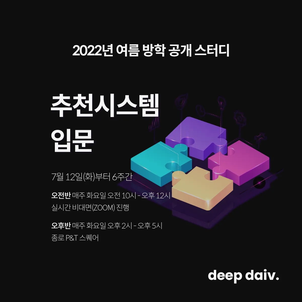 4주차 | 8월 2일(화) | 딥러닝을 활용한 추천시스템 AutoRec (+ 오후반 프로젝트 준비 1시간) |